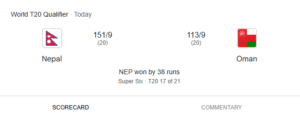 काठमाडौँ, ३० असोज: आइसीसी टी–२० विश्वकप एसिया तथा इष्ट एसिया पेसिफिक छनोटमा नेपालले ओमानलाई ३८ रनले पराजित गरेको छ ।ओमानको अल अमिरतस्थित ओमान क्रिकेट एकेडेमी टर्फ–१ मा भर्खरै सम्पन्न खेलमा नेपालले दिएको १५२ रनको लक्ष्य पछ्याएको ओमानले २० ओभरमा नौ विकेट गुमाएर ११३ रन बनायो ।ओमानका लागि विनायक शुम्लाले १९ बलमा सर्वाधिक ३२ रन बनाए । यस्तै, मोहम्मद नदीमले २५ रन बनाए । नेपालका लागि गुल्शन झाले तीन विकेट लिँदा नन्दन यादव र सोमपाल कामीले समान दुई÷दुई विकेट लिए । सन्दीप लामिछानेले एक विकेट लिए ।त्यसअघि घरेलु टोलीविरुद्ध टस जितेर पहिला ब्याटिङ रोजेको नेपालले निर्धारित २० ओभरमा नौ विकेट गुमाउँदै १५१ रनको योगफल बनाएको थियो । नेपालका लागि कुशल भुर्तेलले ५१ बलमा सात चौका र एक छक्कासहित सर्वाधिक ६९ रनको योगदान दिए । आसिफ शेखले २० बलमा दुई चौका र एक छक्कासहित २४ रनको योगदान गरे । गुल्शन झाले दुई छक्कासहित १८ रन जोडे भने आदिल आलमले १६ रन बनाए ।ओमानका लागि नदीम खानले चार विकेट लिए भने शुफिया मेहमुद र जितेन रामानन्दीले समान दुई/दुई विकेट लिए ।यसअघि नै टी–२० विश्वकपमा स्थान बनाइसकेको नेपाल आठ अङ्क बटुल्दै उपाधि नजिक पुगेको छ । नेपाल अङ्क तालिकाको शीर्ष स्थानमा उक्लिएको छ । दोस्रो स्थानमा रहेको ओमानको छ अङ्क छ ।अब नेपालले शुक्रबार सुपर सिक्सको अन्तिम खेल सामोआसँग खेल्नेछ ।